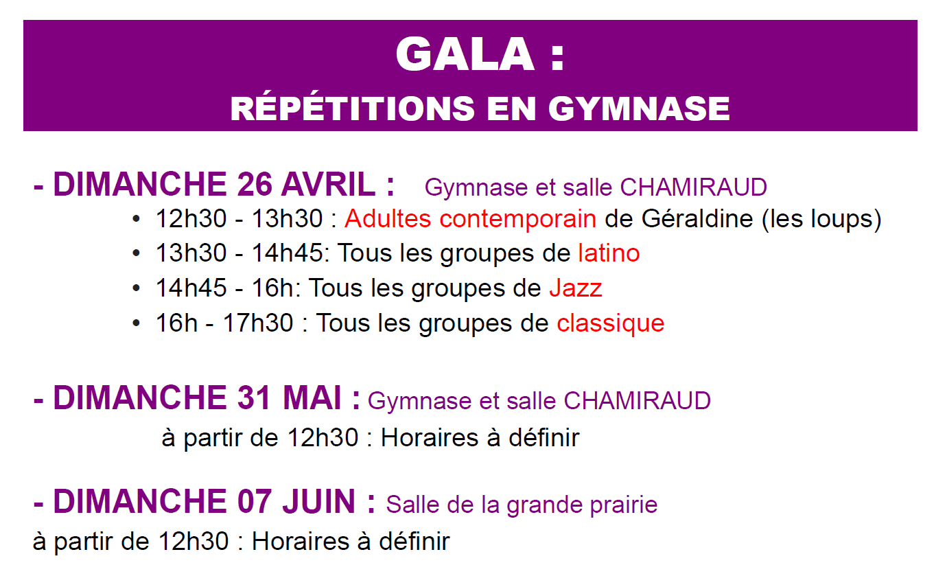 Concernant la première date, seuls « les grands tableaux » du gala sont concernés (tableau adultes contemporain de géraldine – tableau latino – tableau jazz – tableau classique).