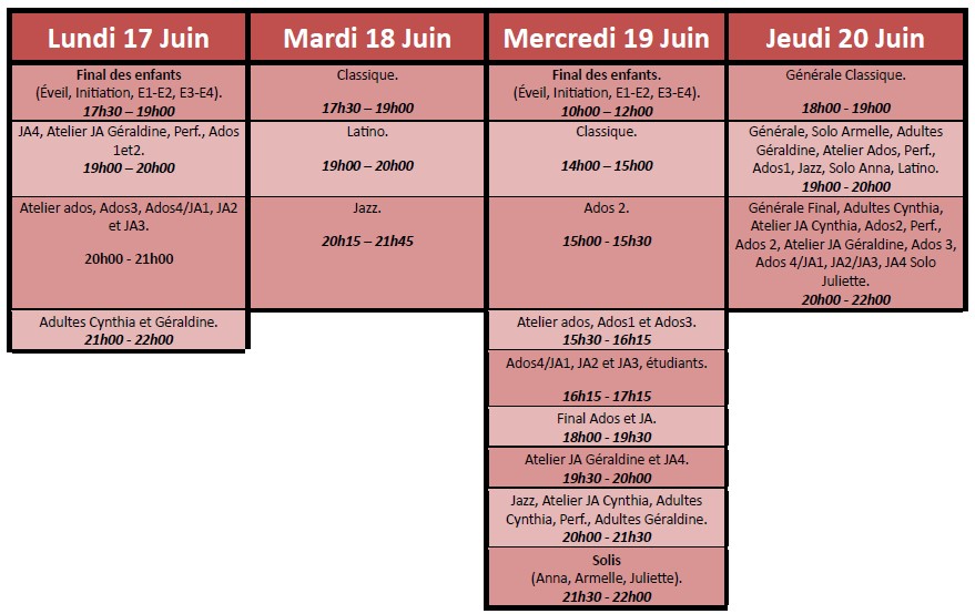 Pour ne rien rater, vous trouverez ci-dessous le tableau rappelant les dates et horaires pour l’ensemble des cours.